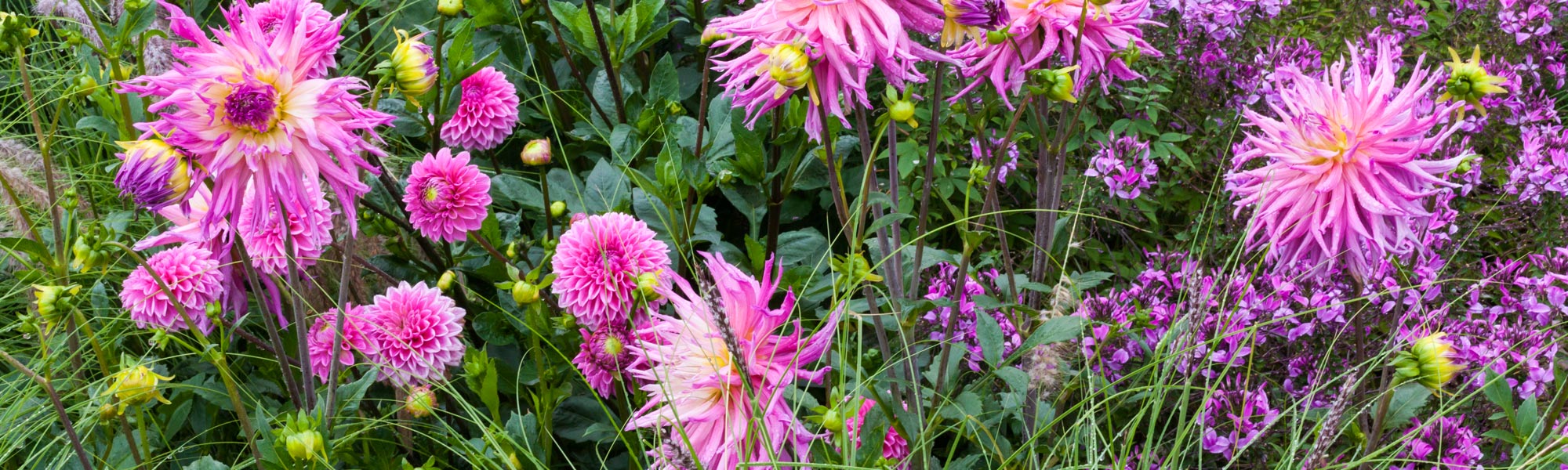 Farblich abgestimmte Sommerflor-Bänder begleiten die Dahlien. Antirrhinum, Digitalis, Scabiosa, Zinnia, Cleome und Co. setzen mit ihren unterschiedlichen Strukturen und Blüten die Dahlien effektvoll in Szene.