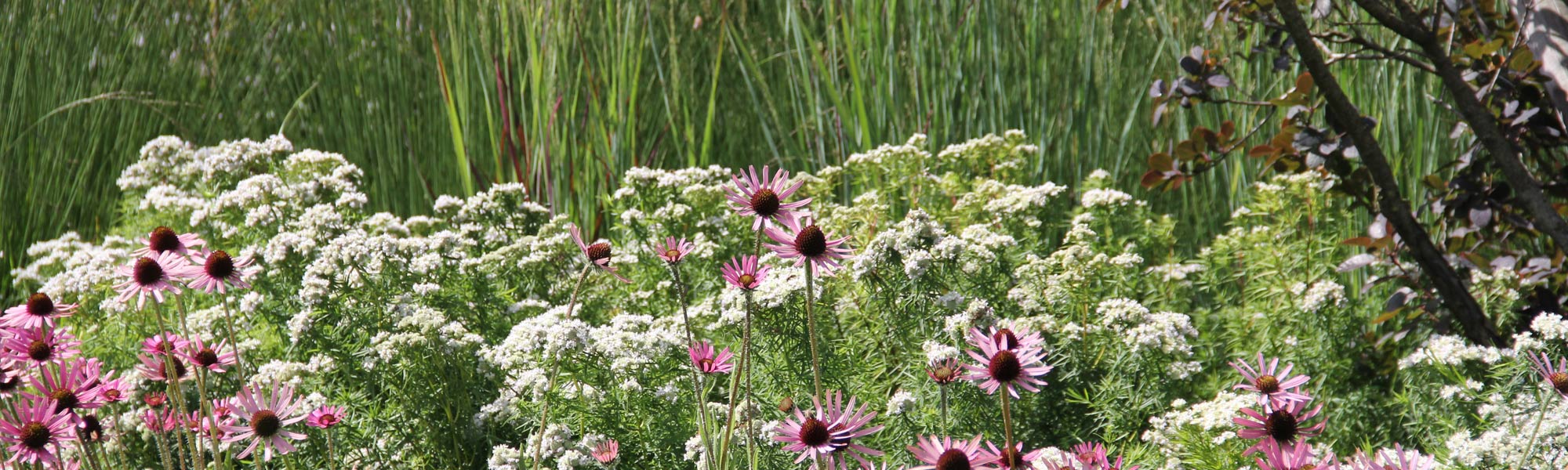 Staudenwellen in Magenta, Bordeaux, Purpur sorgen für Eleganz, Strahlkraft und Fernwirkung. Das Rückgrat der Pflanzung bilden im Wind wogende Gräserwellen.